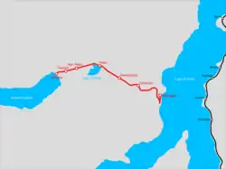 Previous plans to link Menaggio and Luino envisaged an international railway via the Swiss city of Lugano, running for much of its length alongside Lake Lugano. However difficulties in financing the proposal, and the substantial engineering works that would be required alongside the lake, led to a revised plan which was eventually implemented. This involved the construction of two unconnected railways, both entirely located within Italy. The Menaggio–Porlezza railway and the Ponte Tresa–Luino railway were linked by the use of steamboats, between Porlezza and Ponte Tresa on Lake Lugano, to form the desired through route.[1][2]