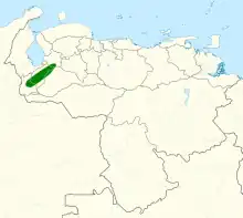 The Merida brushfinch is a year-round resident of the Andes of western Venezuela, in Mérida and the eastern part of Táchira departments. It prefers humid elfin and oak-dominant forest and is a bird of dense undergrowth including ferns and bamboo within and along the borders of such forests. It also inhabits drier woodland with dense undergrowth and is tolerant of disturbed habitats. The brushfinch is found primarily between 1,600 and 2,500 m (5,200 and 8,200 ft) but has been found as low as 1,000 m (3,300 ft).[3]