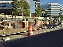 The station was rebuilt with a 510-foot (160 m) six-car-long high-level platform on the west side of the tracks, slightly north of the former station. The new station has a full-length canopy and an accessible pedestrian overpass with elevators.[6] The state authorized funding for the project in 2017.[7] Bidding took place in April–June 2020; construction began that September.[8][7] The new platform opened on June 7, 2023, but the opening of the footbridge over the tracks to the office park was delayed due to supply chain issues with glass panels,[9] which opened on January 12, 2024.[10]