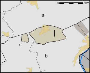 The territory of Mesen (marked 'I') and its immediate neighbours. Built-up areas are shown in yellow.