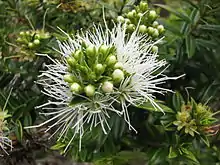 Metrosideros operculata is a species of flowering plant in the family Myrtaceae. It is endemic to New Caledonia.[2] It usually grows as a shrub to 3 metres in height, or rarely as a small tree to 10 metres. Stems are square in section and covered with silky hairs. The stiff, pointed leaves have a slightly revolute margin and are linear to elliptic in shape. They are 12 to 40 mm long and 3 to 10 mm wide. White, pink or red flowers with 3 petals and between 50 and 120 stamens are produced in axillary inflorescences.[2]