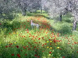 A shepherd from the village had several different dreams during a period of time. Always in these dreams, a knight (ref: rider, Saint George) was riding a white horse, while the shepherd was herding his sheep. In each dream, the knight told the shepherd to tell the mayor and the priest of the village to dig in this particular spot (33°32′45.00″N 35°23′16.98″E / 33.5458333°N 35.3880500°E) and your town will have a natural water spring. And the rider added, in case the people in town did not believe you; take this olive branch with fruits on it as a proof. When this event occurred, the harvest of the olive fruit was long gone. The people of the village did not believe the shepherd at first, until he showed them the olive branch with the fruits on it. They dug where Saint Georges pointed, and water came out. St. Georges Natural Spring became a holy place and is called in Arabic “Nabaat Mar Giryos". The natural spring became the destination for many people, mainly for praying and healing. The elderly in the village are still telling this story from generation to generation. Unfortunately, after the civil war in 1985 in Miye ou Miye and the displacement of the town's people, the St. George's natural spring was bulldozed and covered with dirt and debris.[7]