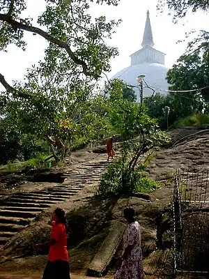Mihintale is a mountain peak near Anuradhapura in Sri Lanka. It is believed by Sri Lankans to be the site of a meeting between the Buddhist monk Mahinda and King Devanampiyatissa which inaugurated the presence of Buddhism in Sri Lanka. It is now a pilgrimage site, and the site of several religious monuments and abandoned structures.