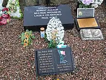 The cemetery has, for some, become synonymous with Irish republicanism. Irish Republican Army prisoner Bobby Sands, who died on hunger strike on 5 May 1981, is buried in the cemetery. Fellow hunger-strikers, Kieran Doherty, Joe McDonnell and Pat McGeown (who died of a heart attack in 1996) are also buried there. In total, 77 IRA volunteers are buried in what is known as the 'New Republican Plot', a further 34 volunteers are buried in what is known as the County Antrim Memorial Plot and which was used between 1969 and 1972.[2] Throughout the cemetery, many more IRA volunteers are buried in family graves. These include Tom Williams, who was executed in Crumlin Road Prison on 2 September 1942. Williams' body lay in a prison grave until January 2000, when a campaign, by the National Graves Association, Belfast, to have his remains re-interred in Milltown was successful.[3] Members of the INLA, IPLO and Workers' Party are also buried there.[1]