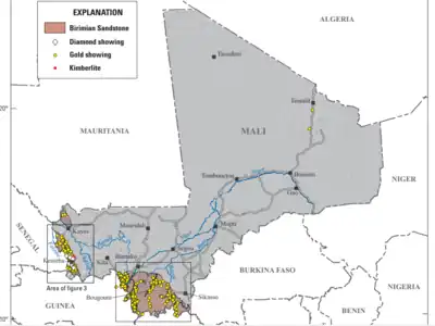 The mining industry of Mali is dominated by gold extraction but also produces diamonds, rocksalt, phosphates, semi precious stones, bauxite, iron ore, and manganese.[1][2] The importance of mining and production of raw minerals has changed throughout time and has involved many foreign stakeholders, most notably France, the former Soviet Union, and South Africa. Gold, followed by cotton, is the top export item, making it a large contributor to the country’s economy.[3] Mineral extraction in the country is done both via industrial mining and artisanal mining, and both methods of production have had profound impacts on the economy, sociocultural landscape, and environment.