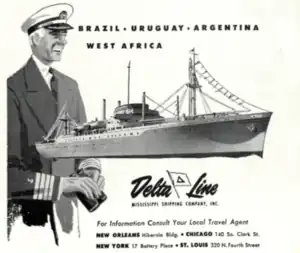 Mississippi Shipping Company (also called Delta Line) of New Orleans, Louisiana was a passenger and cargo steamship company founded in 1919. In 1961 officially changed its name to the Delta Line. The Mississippi Shipping Co. serviced port from the Gulf of Mexico and east coast of South America. The Mississippi Shipping Co. was formed to support coffee merchants and Brazilian produce to New Orleans and up the Mississippi River. competing with the New York City trade. Delta Line failed to upgrade to container ships and modernize as other shipping lines did in the 1970s. In 1982 Delta Line, now owned by the Holiday Inn Corporation sold the line to Crowley Maritime. Crowley was the largest US barge and tugboat operator at the time. Crowley started to modernize the ships on the route, but sold the shipping line to the United States Lines in 1985. United States Lines brought some of the ships into its routes but went bankrupt in 1986. At its peak in 1949, the Mississippi-Delta line owned 14 ships at a total of 98,000 grt. Delta Line also moved into passenger cruise with to ship. During World War II the Mississippi Shipping Company was active with charter shipping with the Maritime Commission and War Shipping Administration. During wartime, the Mississippi Shipping Company operated Victory ships, Liberty shipss, and a few Empire ships.[1][2][3][4]