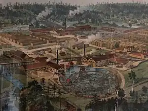 The town was planned by a company architect/engineer with a main street that had the company store, a hospital, hotel and other commercial buildings, surrounded by large lawns and decorative landscaping. Residential streets were laid out for up to 1000 houses. Just outside of town were a railway roundhouse, blacksmith and other machine shops. Between the town and the mills on the east was an 80 acres (32 ha) lumberyard.[3] The headquarters building was the town's financial center where employees were paid monthly on the tenth. It had a vault and teller booth.[lower-alpha 2][5]