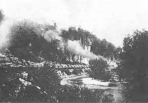 The company then turned its attention to Carter County, where its holding had grown to 100,000 acres (40,000 ha) with additional acreage in adjacent Ripley County. It identified a desirable mill location and sought the needed rail access. The company made a distribution deal with the Kansas City, Fort Scott and Memphis Railway (KFS&M).[3] The KFS&M had already built a line from Springfield to Thayer in 1882. The railroad agreed to construct an 81 mi (130 km) spur from this line running from Willow Springs, Missouri to MLMs land in the Current River Valley in exchange for a guaranteed minimum amount of lumber shipments. A five-year agreement between the companies in February 1887 specified that MLM would ship all its lumber going west of the Mississippi on the KFS&M or its affiliates. The MLM also agree to have a mill operational by the time the line was complete.[3] The spur, organized as the Current River Railroad was completed in 1888.[3] Later that year, the Cape Girardeau Southwestern Railroad extended a line from the east allowing the mill to more directly supply eastern markets as well.[2] The Cape Girardeau line met the Current River line in Hunter, Missouri, about 5 mi (8.0 km) from the Current River terminus at the MLM mill site.[3]
