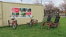 In addition to conventional bicycles, MoGo also offers a small fleet of sixteen alternative cycles, including tricycles and recumbent bicycles, for use by people with disabilities.[5][18] These specialized cycles are not compatible with the equipment of the more comprehensive MoGo rental network, and as such are only offered seasonally (from May through October) at two staffed locations (one on the Detroit River Walk, and another in Ferndale) during limited hours.