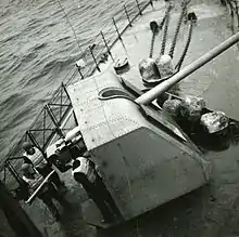Weaponry was manufactured in Sweden. The main armament consisted of three 10.5 cm (4 in) K/50 M42 guns produced by Bofors.[8] These were placed in separate mounts, one on the fore deck, one on the aft deck and one on the aft superstructure.[3] Air defence consisted two 40 mm (1.57 in) K/60 M36 and two 20 mm (0.79 in) K/66 M40 individually mounted anti-aircraft autocannons, also provided by Bofors.[7]