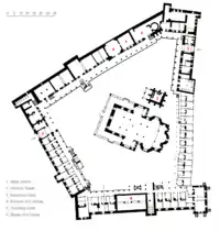 The whole complex occupies an area of 8,800 m2 and is rectangular in form, centred on the inner yard (3,200 m2), where the tower and the main church are situated.