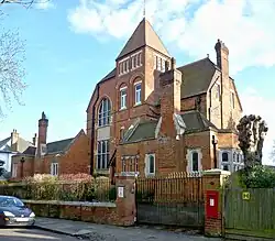 Monkenhurst was built in 1880[1] to a Victorian Gothic[2] design by Peter Dollar[3] and enlarged in 1915.[1] It is of red brick with three storeys and a pyramid-capped tower.[3] Stained glass windows, acquired from Northumberland House[2] (demolished 1874), show the crests of participants in the Wars of the Roses[1] in reference to the Battle of Barnet, a key battle in the conflict that took place nearby.[4]