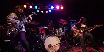 In terms of instrumentation, Mono is a four-piece instrumental rock band. Goto, the group's lead guitarist, uses a 1966 Fender Jazzmaster through Boss, Danelectro, SiB, and Morley effects pedals, into a Fender Twin, a Marshall JCM 2000 head, and a Marshall cabinet for amplification.[30] Yoda, the rhythm guitarist, uses a 1974 Fender Stratocaster through Boss, Tech 21 and Pro Co effects pedals, into a Fender Twin for amplification.[30] Kunishi, the group's bass guitarist, pianist and occasional guitarist uses a 1966 Gibson EB-3 through Boss, TC Electronic, and Tech 21 effects pedals, into an Ampeg B2-R head and a Sunn bass cabinet, as well as a Fender Rhodes, and a Fender Jazzmaster.[30] Takada, the drummer, uses a four-piece 1970s Ludwig drum kit, with Zildjian, Sabian, and Paiste cymbals, as well as a Korg microKORG synthesizer.[30]