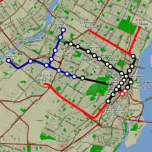 In 2017, Valérie Plante proposed the Pink Line as part of her campaign for the office of Mayor of Montreal. The new route would have had 29 stations and would have primarily linked northeastern Montreal with the downtown areas, as well as the western end of NDG and Lachine.[46] The project has since been added to Quebec's 10-year infrastructure plan, and feasibility studies for the line's western section began in June 2021.[47]