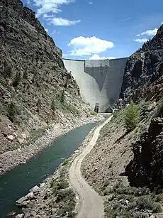 Morrow Point Dam is a 468-foot-tall (143 m) concrete double-arch dam on the Gunnison River located in Colorado, the first dam of its type built by the U.S. Bureau of Reclamation. Located in the upper Black Canyon of the Gunnison, it creates Morrow Point Reservoir, and is within the National Park Service-operated Curecanti National Recreation Area. The dam is between the Blue Mesa Dam (upstream) and the Crystal Dam (downstream). Morrow Point Dam and reservoir are part of the Bureau of Reclamation's Wayne N. Aspinall Unit of the Colorado River Storage Project, which retains the waters of the Colorado River and its tributaries for agricultural and municipal use in the American Southwest.[1][2] The dam's primary purpose is hydroelectric power generation.[3]