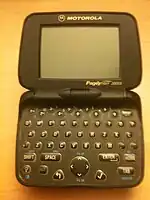 The Motorola PageWriter 2000 was a two-way pager introduced in 1998.[1] Featuring the 68000 based Motorola DragonBall processor, 1 MB of internal storage, a four color grayscale screen, IrDA transmitter/receiver, and a full QWERTY keyboard the PageWriter represented a combination of both PDA and pager in one package. For wireless connectivity the PageWriter used SkyTel's ReFLEX paging network to send and receive messages to other pagers or to email addresses.