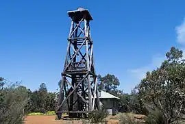 Mount Wells's history since colonisation, as the highest point in the area, was as a fire lookout for the surrounding timber milling region. The original fire tower and huts were ironically destroyed by fire in 1961, but rebuilt in 1962. It was renovated by the Department of Conservation and Land Management (CALM) and a Karnet Prison crew in 1997 for overnight use by walkers on the 'new' Bibbulmun Track, Western Australia's award-winning walk trail, stretching nearly 1,000 kilometres from the Perth Hills to Albany.[3]