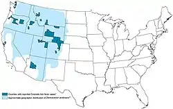 Geographic distribution of Dermacentor andersoni ticks and Colorado tick fever virus disease cases, United States, 2010–2019.