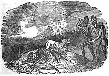 Moustache is said to have left the cuirassiers after he was struck by a cavalryman with the flat of his sword.[11] De Fivas says that he attached himself to a unit of dragoons which he followed to Spain, taking part in two campaigns with them during which he would walk ahead of their column and bark warnings whenever he heard a noise.[11] During a battle in the Sierra Morena mountain range in southern Spain Moustache is alleged to have led back to camp the horses of dragoons killed on the battlefield.[11] Shortly after this he is said to have been secretly taken by a Colonel who wished to own him. After spending seventeen days in captivity the dog apparently escaped by an open window and joined with a gunboat crew.[11] Afterwards he participated in the Battle of Badajoz where he was struck by a cannonball and killed on 11 March 1812, at the age of twelve years.[nb 1]