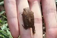The Mozambique rain frog (Breviceps mossambicus), also known as the flat-faced frog, is a species of frog in the family Brevicipitidae.[2] It is found in Botswana, Democratic Republic of the Congo, Eswatini, Malawi, Mozambique, South Africa, Tanzania, Zambia, Zimbabwe, and possibly Lesotho. Its natural habitats are dry savanna, moist savanna, temperate shrubland, subtropical or tropical dry shrubland, temperate grassland, subtropical or tropical dry lowland grassland, subtropical or tropical high-altitude grassland, arable land, pasture land and rural gardens.[1]