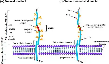 The N-terminus of MUC-1 (MUC-1 N) contains variable number tandem repeats (VNTRs) of (PDTRPAPGSTAP PAHGVTSA). VNTR provides sites for glycosylation on proline, serine and threonine residues.[9] The peptide backbone exhibits glycosidic bonds between serine and threonine within MUC-1 N. [10] Within the cytoplasmic tail of MUC-1, multiple phosphorylation sites exist due to the presence of threonine, tyrosine and serine amino acid residues.[7] Alterations to the cytoplasmic tail may affect movement through the Golgi apparatus, thus affecting glycosylation of the tandem repeat domains of MUC-1.[6] The C-terminus of MUC-1 (MUC-1 C) is short—the majority of weight comes from N-glycosylation.[11] Research has shown that the C-terminus is linked to the development of inflammation and cancer.[12]