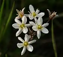 Muilla maritima is a species of flowering plant known by the common names sea muilla and common muilla. It is native to California and Baja California,[1] where it grows in many types of habitats from the coast to the Mojave Desert and Sierra Nevada foothills and other inland mountains, in grassland, woodland, desert, and forest floras. It is a perennial plant growing from a corm and producing an erect flowering stem up to half a meter tall. The onion-like leaves at the base of the stem may be 60 centimeters long. The flowering stem bears an umbel-shaped array of many flowers on pedicels up to 5 centimeters long. Each flower has six tepals which are green-tinged white in color with brownish midribs and no more than 6 millimeters in length. At the center of the flower are six erect stamens with blue, green, or purplish anthers.[2][3][4]