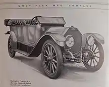 The Multiplex was a sporty, upper-priced and large car equipped with a four-cylinder engine, and offered as a Touring, a Roadster, and a Raceabout. A prototype "Sports" car with an 85 inches (2,200 mm) wheelbase, weighing in at just 980 pounds (440 kg) and allegedly capable of a top speed of 126 mph (203 km/h) was also built.[1]