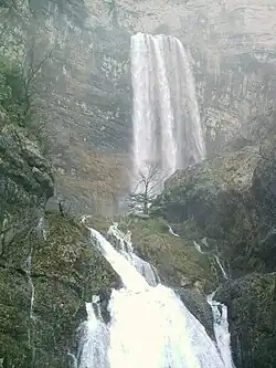 The Mundo river is well known for its picturesque source (Reventón del Rio Mundo), which is considered to be one of the world's most beautiful river sources. The river originates from a cave in the middle of a tall cliff and forms a waterfall with a height of almost 100 meters. Subsequently, it forms a series of smaller cascades and pools. The cave itself is about 15 meters wide and 25 meters high and constitutes the end of a large cave system under the Calar del Mundo.[5]