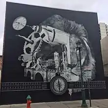 • 2016: The Atlas of Tomorrow: A Device for Philosophical Reflection (533 South Juniper Street, Philadelphia) is a piece by Candy Chang, an artist whose pieces often have a participatory element to them. In this kinetic mural, viewers are invited to spin a numeric dial. Where the dial lands directs the viewer to read and reflect on one of 64 unique stories.[28]