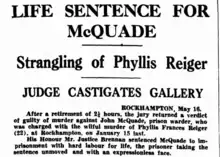 13. "McQuade found guilty of murder; sentenced to life imprisonment". The Central Queensland Herald. 23 May 1935. Retrieved 27 August 2022.