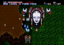 MUSHA is a vertically scrolling shooter.[8] The player takes on the role of Terri,[lower-alpha 2] a pilot who flies a specially designed mecha vehicle with advanced weaponry called a MUSHA. She is sent to fight the human-built Dire 51[lower-alpha 3] supercomputer that has begun attacking Earth from space in the year 2290.[6]: 6 The gameplay conventions are largely retained from earlier Aleste titles.[8] The player has a main gun that can be powered up by collecting "Power Chips". There are also three different special weapons that can be picked up: piercing lasers, fire-based explosives and rotating shields. They can be upgraded if the same weapon is picked up that is currently being used. If hit while a special weapon is equipped, the player will lose the special weapon but remain alive. Getting hit without a special weapon will result in losing a life.[6]: 14–15 For every three Power Chips collected, the player obtains a drone similar to those in the Gradius series. Only two drones can be equipped at any one moment; extras are stored. These drones can be set to one of six attack modes, such as aiming forward, behind, or rotating around the player.[8][6]: 17