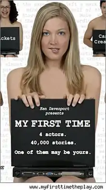 My First Time is an off-Broadway play that opened on July 12, 2007 at New World Stages and ran until January 22, 2010. The show is based on a website started by Peter Foldy and Craig Stuart that grew in popularity in 1998. The site "allowed people to anonymously share their own true stories about their First Times"[1] and "features four actors in hysterical and heartbreaking stories about first sexual experiences written by real people ... just like you."[2] Experiences submitted by the audience before the performance are featured during the show, and My First Time received press from CNN.com, TMZ[3] and Forbes when it featured a promotion during which virgins could attend the play for free.