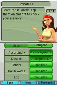 Whenever a player correctly answers a question or solves a puzzle in a minigame, they gain "mastery points" on the word they successfully answered. The minigames can be increased in difficulty; on higher difficulty levels, players will acquire more mastery points when successfully completing a minigame.[6] For instance, in Multiple Choice, the player has 50 seconds to select an answer for a question on the "Easy" difficulty, and will receive two mastery points for each correct answer. On the "Medium" difficulty, the player has 40 seconds to select an answer and receives three mastery points for each correct answer.[11] The process continues until the player scores fifteen mastery points for every word, allowing the player to proceed to the next lesson.[17] Following the completion of all fifty lessons, the player can continue to learn new words through "open lessons" that contain ten new vocabulary words apiece; the dictionaries of both games each hold nearly 10,000 words.[6][8][18][19] The player can freely access the reference section, which contains a dictionary and phrasebook, at any time. Both the dictionary and phrasebook hold all of the words and phrases in each game, as well as meanings and audio files for both; the player can look through different categories of words and phrases, use a search function, and bookmark chosen phrases.[20][21][22]