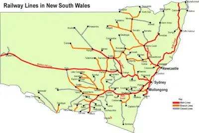 The Australian state of New South Wales has an extensive network of railways, which were integral to the growth and development of the state. The vast majority of railway lines were government built and operated, but there were also several private railways, some of which operate to this day.