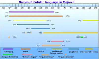 The first names, or glossonyms, of the Catalan/Valencian language formed in a dialectal relation with Latin, in which Catalan existed as a variety. These names already expressed the relationship between the two languages (Council of Tours 813). New names that related Catalan to Rome (lingua romanana, romançar or romanç) came about to dignify the Catalan language in the thirteenth century, though Latinists called it vulgar (or sermo vulgaris) and the people planus, or pla.