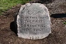 The next mill was constructed in 1682 at Mill Lane.[29] Originally requested by Jonathan Fairbanks and James Draper, the privilege was granted to Whiting and Draper instead, likely to avoid any more problems with Whiting.[30][29][8] Whiting died on the day the rights were granted to him, however.[1] This mill was for fulling wool, and was the first textile mill in Dedham.[8] A condition was attached to this permission, however, that if the Town wanted to erect a corn mill on the brook that they may do so, unless Draper and Whiting did so at their own expense.[31] This mill, like the one above it, was held by Whiting's descendants for 180 years.[29][8] One of Whiting's mills burned in 1700, and so the Town loaned him 20 pounds to rebuild.[32][25]