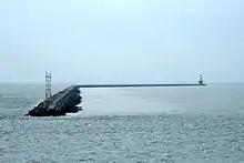 In 1826, William Strickland began to design the breakwater, which would be the first of its kind in the Western hemisphere and the third in the world,[2][3] after one in Cherbourg, France, and the Plymouth Breakwater at Plymouth, England. Work began in 1828 on what is now the inner breakwater, listed in its own right on the National Register as the Delaware Breakwater. These works consisted of a 2,100-foot (640 m) main breakwater and a 1,700-foot (520 m) icebreaker pier.[2] Both were built of granite rubble from New Castle County, Delaware, with earlier portions using smaller stones from the Hudson Palisades. The breakwaters are 160 feet (49 m) wide at the base and 20 feet (6.1 m) at the top. The project used 835,000 tons of stone. Strickland also designed a lighthouse for the harbor, which was completed the next year.