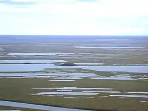 The NPRA is an ecologically very important area, and human settlements are small and rare.[3] For birds, it has been called "Heathrow at the top of the world" with more birds in the NPRA than in the Arctic Wildlife Refuge. [4] It contains Teshekpuk Lake, an important nesting ground for many species of migratory birds, including shorebirds and waterfowl. The NPRA supports more than a half million caribou of the Western Arctic and Teshekpuk Caribou Herds. The Western Arctic Herd calves in the Utukok, Kokolik and Colville uplands, while the Teshekpuk Herd calves in the areas surrounding Teshekpuk Lake. The highest concentration of grizzly bears in Alaska's Arctic, as well as wolverines, and wolves prey on the abundant caribou.[5]