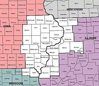 The counties in Iowa (21), Illinois (13), and Missouri (2), highlighted in white, served by the Quad Cities WFO