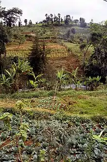 Most of the area that is now cultivated on the slopes of Mount Kenya used to be forest. During the deforestation to provide land for crops and grazing some trees were left standing. From these trees it is possible to get an idea of trees that used to exist in the forests. However, it is not at all representative since trees were usually felled or retained for specific reasons. Sacred and useful trees were often standing, and other trees that were more frequently retained were those that grow well alongside food crops as well as species that provide shade for grazing animals. Fig trees are considered sacred by the Kikuyu, so can frequently be seen standing on their lands.[7] As well as selectively retaining native trees, plantations of exotic trees can also found, such as those of pine, eucalyptus and cypress.[7] For these reasons one must be careful when inferring the original composition of the forests.[8]