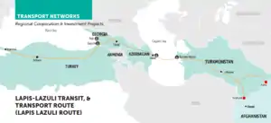 Afghanistan's geographical location makes it economically secured.[125][126][21][127][128][129][130][131] The Lapis Lazuli corridor connects Afghanistan with Turkmenistan and ultimately ends somewhere in Europe.[132] Other such trade routes connect Afghanistan with neighboring Iran, Pakistan, Tajikistan and Uzbekistan.[133] The country also has direct trade with China and India via air corridor.[134] It has four international airports, which include: Kabul International Airport in the capital city; Mazar-e Sharif International Airport in the north of the country; Herat International Airport in the west; and the Ahmad Shah Baba International Airport in Kandahar.[135] It also has about 24 domestic airports.[136] The major airlines of the country include Ariana Afghan Airlines and Kam Air. Its national rail network is slowly expanding to connect Central Asia with Pakistan and Iran.[137][138][139] In addition to Central Asia, imported goods also enter by rail from neighboring Iran and China.[140][141]