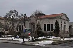 The historic district encompasses much of the civic and institutional core of downtown Naugatuck. It extends south from the junction of Church, Water, and Meadow Streets, all of which eventually run south, forming spines of the district. Terrace Avenue and Fairview Avenue form the western side of the district, whose southern boundary is an east–west line roughly at Pleasant View Avenue. A finger extends eastward along Cedar Street to include the town's Spanish Revival railroad station. Prominent buildings in the district include the Whittemore Library, a McKim, Mead & White design, the main post office, like the railroad station in a Spanish Revival style, and the Bronson B. Tuttle House, located at the northernmost end of the district. The Tuttle House is a fine brick Victorian mansion, and the only major industrialist's residence to survive in the city.[2]