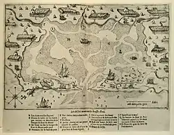 ![]() A 1605 map showing Nauset Harbor lined with the wigwams of the Nauset tribe | |