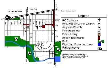 West End ("Cathedral Area") and the Crescents, showing location relative to Exhibition Park, Taylor Field, central business district, Wascana Creek and Wascana Lake. Weir holding back Wascana Lake is under the Albert Street Bridge.