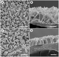 Centre: Scanning electron micrographs revealing the ultrastructure of N. gracilis wax crystals on the inner surface of the pitcher (A and B) and underside of the lid (C and D).