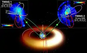 Usually, obtaining images from a spinning spacecraft provides the second dimension of direction identification. By combining synchronized observations from two different satellites, stereo imaging becomes possible.[2] Results from the TWINS Mission are eagerly awaited, as two viewing points will provide substantially more information about the 3-D nature of Earth's magnetosphere.