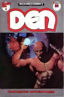 Corben created Den as the protagonist of a film short titled Neverwhere while working at Calvin Studios, an animation company in Kansas City.[1] The film is animated, with framing sequences filmed in live-action. Corben's boss at Calvin played the title character in the movie. He drew the whole animated sequence by hand in his spare time. His employers, impressed by his work, helped him to finish it by editing it and adding a new professional soundtrack with actors' voices. It was submitted to film festivals and won several awards, including the CINE Golden Eagle Award. The story continued in comic form from then on. Den made his comic debut in a short comic book story that appeared in Grim Wit No.2 in September 1973. Corben expanded this short story to two parts for publication in Métal Hurlant (1975–1976). He continued the story, turning it into a 12-part serial called "Den", for the first twelve issues of Heavy Metal magazine (1977–1978). He added an epilogue, "Den's Farewell", which was printed in issue No.13 (April 1978). The original story, without the epilogue, was published in the trade paperback Neverwhere (Ariel: Feb. 1978). All 13 chapters featured in the trade paperback Den: Neverwhere (Catalan: 1984).[2]