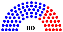 The Assembly has 80 members, two for each district. Membership of the General Assembly is as follows:[14][15]