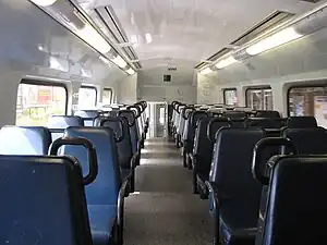 The C set carriages were also the first on the suburban network to feature fixed seating (originally covered with fabric, since replaced with vinyl).[2] These cars also featured push-button doors requiring passengers to activate, to increase air-conditioning efficiency. These proved unpopular and the push-buttons on the doors were removed.