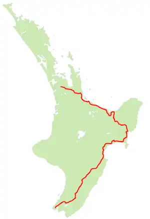 State Highway 2 (SH 2) runs north–south through eastern parts of the North Island of New Zealand from the outskirts of Auckland to Wellington. It runs through Tauranga, Gisborne, Napier, Hastings and Masterton. It is the second-longest highway in the North Island, after State Highway 1, which runs the length of both of the country's main islands.